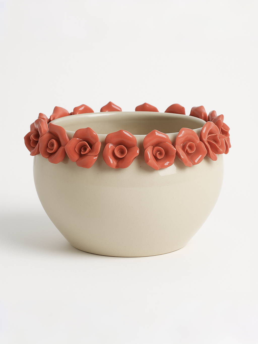 Elevate your home décor with this exquisite handcrafted ceramic floral planter, artfully adorned with delicate coral rose accents along the rim. Each planter is meticulously crafted by skilled artisans, ensuring a unique piece that combines both beauty and practicality. Perfect for displaying creativity & simply adding a touch of elegance to your living space, this planter is sure to become a cherished centerpiece in any room. Measuring approximately 5 inches in diameter, its soft ivory background perfectly complements the vibrant coral roses, making it a versatile addition to any décor style.